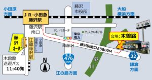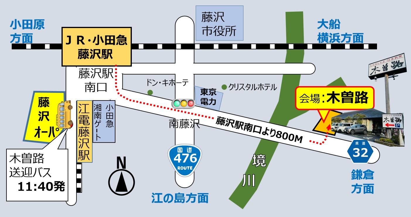 ※懇親会会場「木曾路 藤沢店」までマイクロバスの送迎があります。藤沢駅南口「湘南藤沢 オーパ」 ビル前 を11時40分に出発します。ご希望の方はご利用ください。