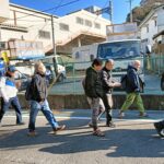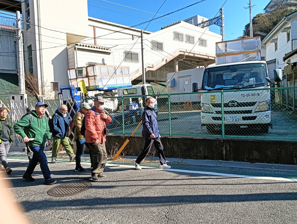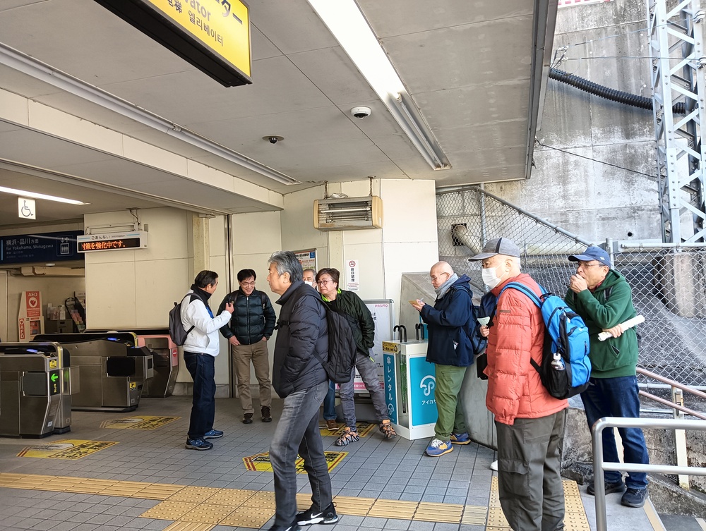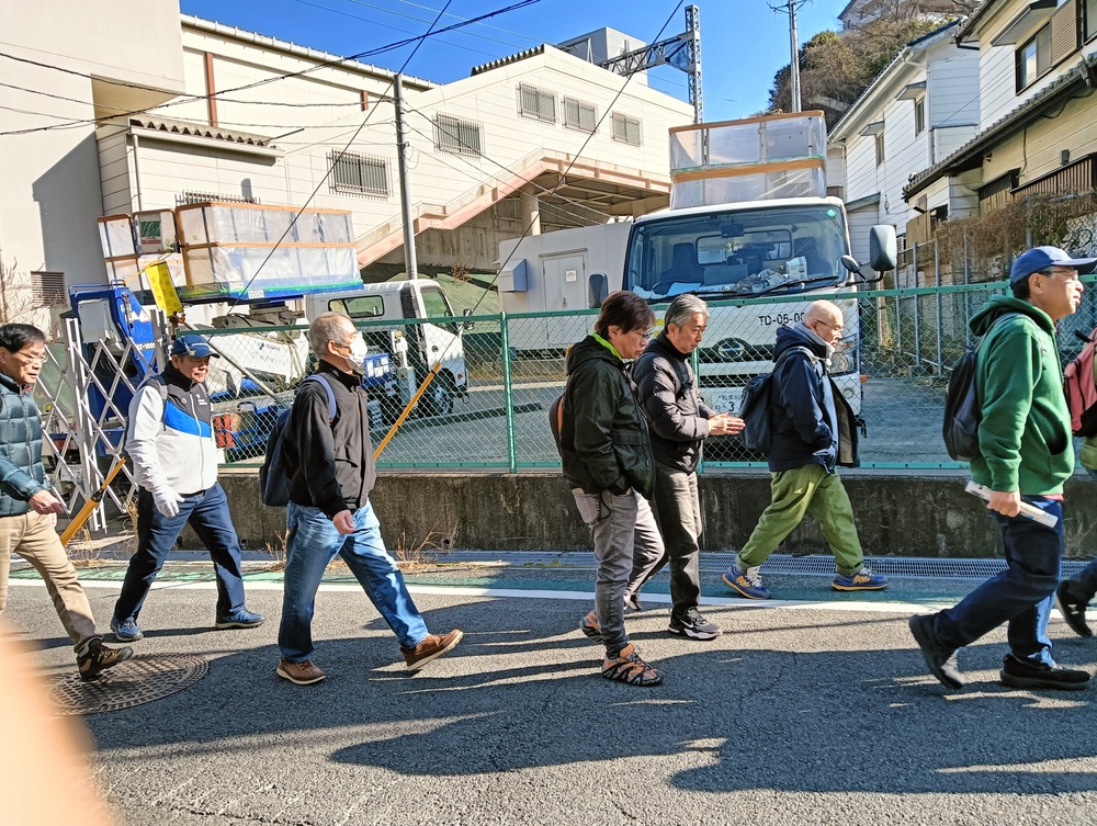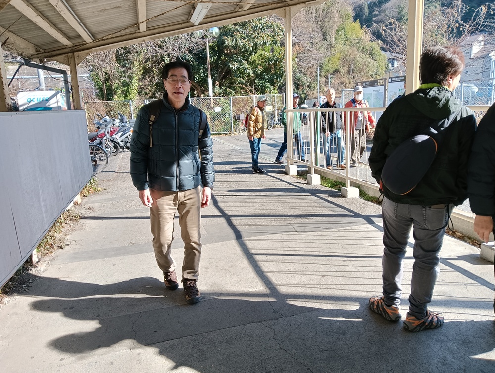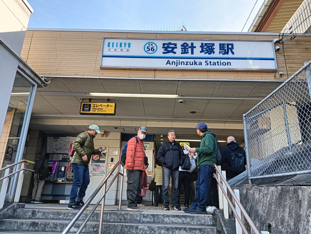 世話人より本日のコース説明を受けた後、最初の目的地県立塚山公園に向かって元気に出発。安針塚駅は、徳川家康に仕えたイギリス人航海士 ウィリアム・アダムス(三浦安針) に由来します。