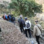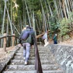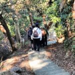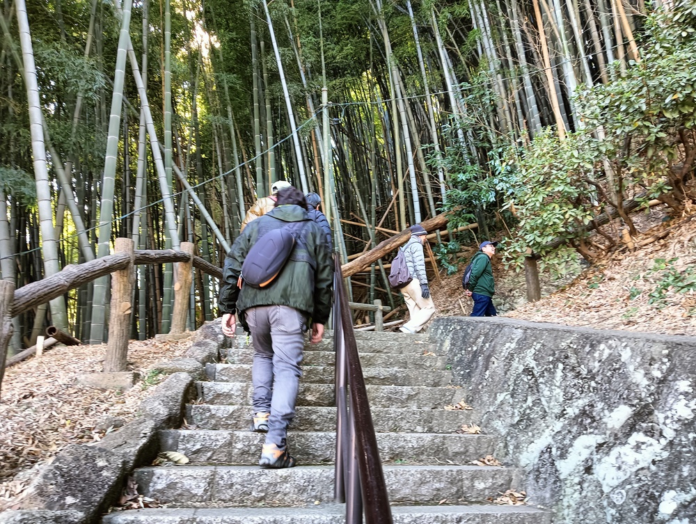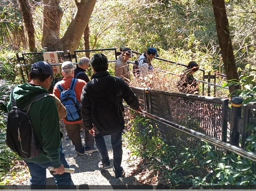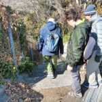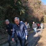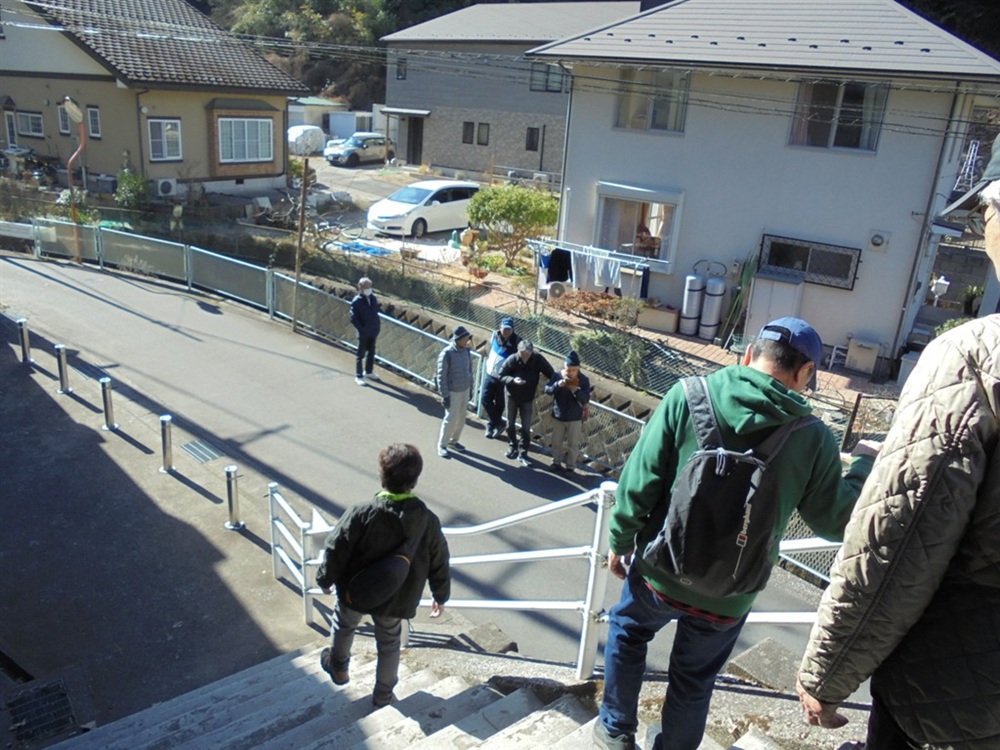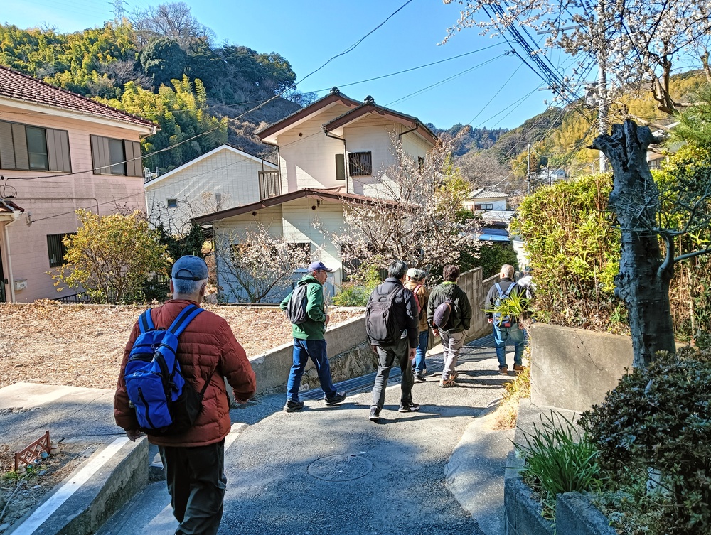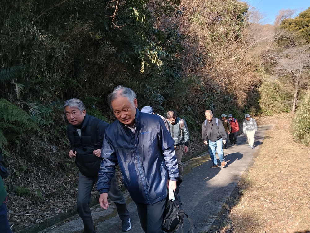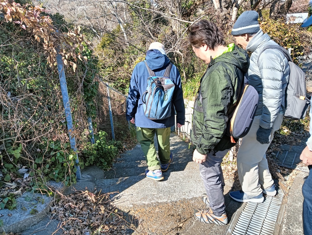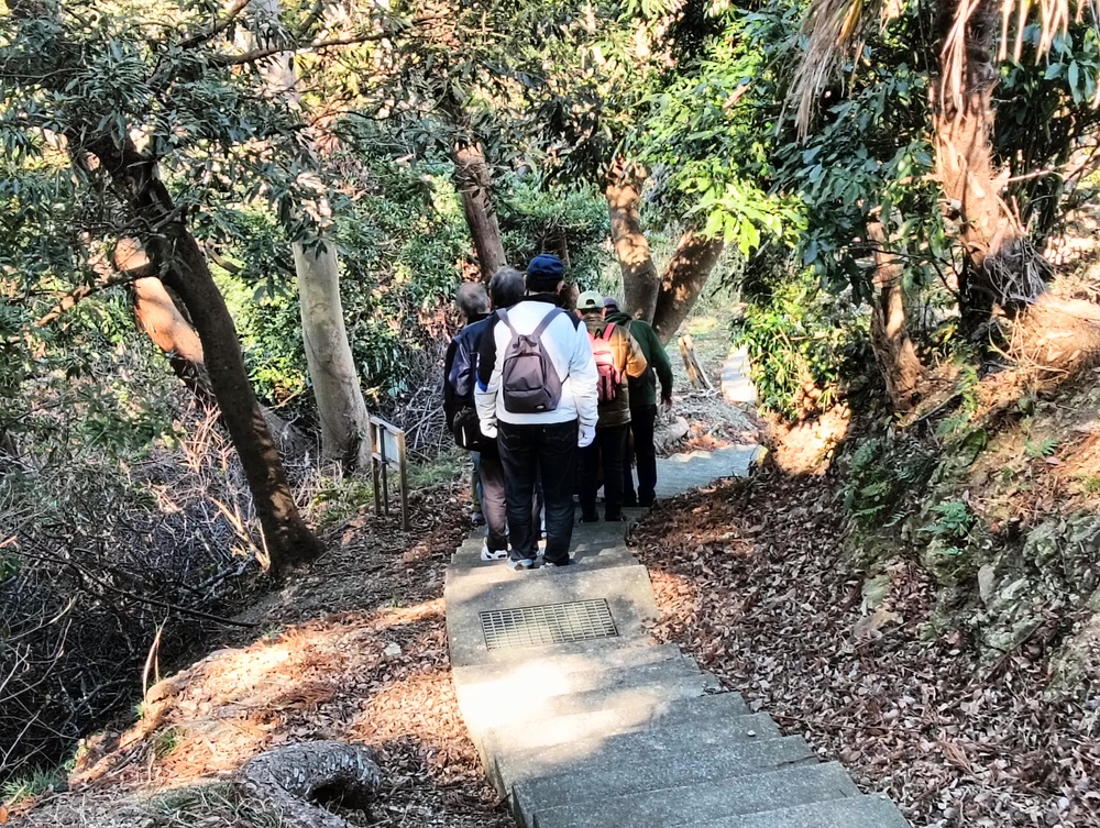 田浦梅の里に向かって、今は自動車も通る舗装された道もありますが、近所の方に教えていただいた旧浦賀道を歩きました。ここは非常に険しい坂道ばかりで参加者一同息も絶え絶えで、昔の旅人や村人たちの苦労が偲ばれました。