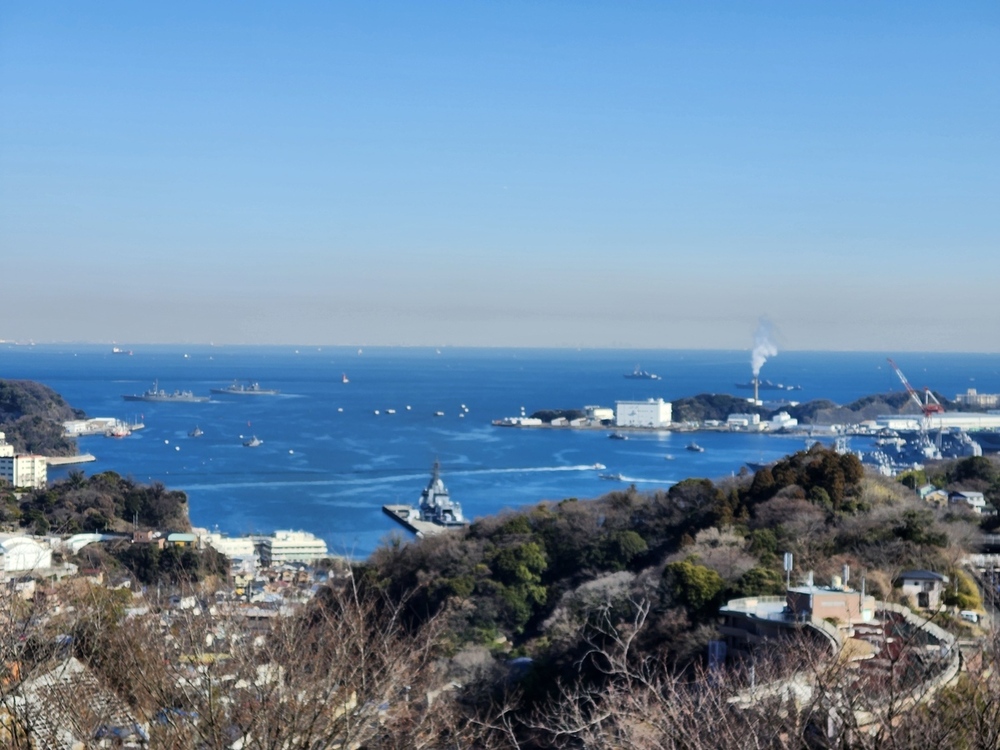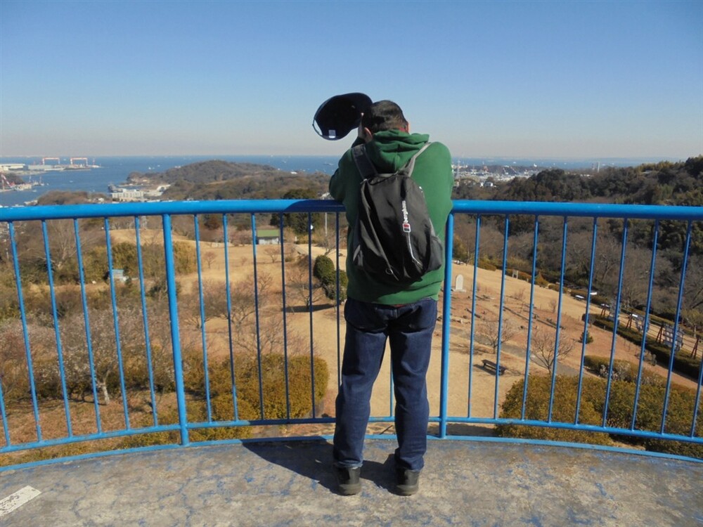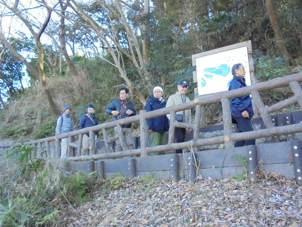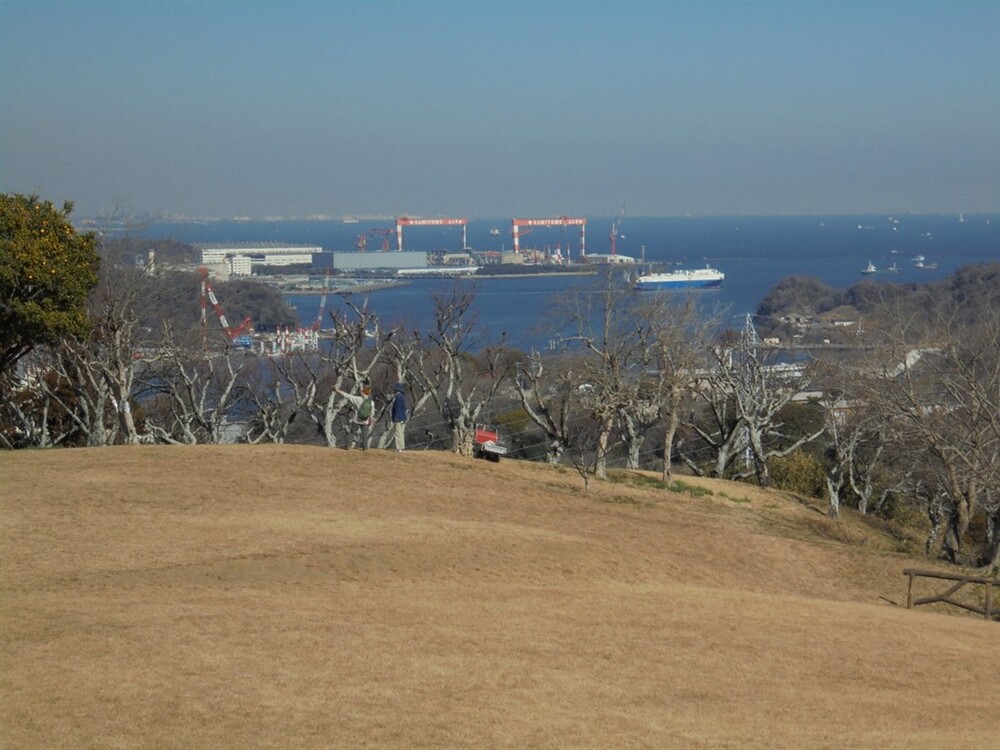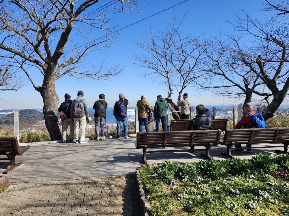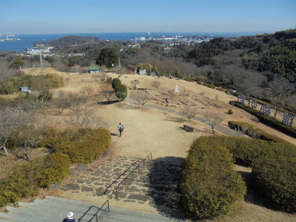 塚山公園は、標高約133mの塚山一帯を整備した県立公園で、戦前から軍港・横須賀を守る要衝でした。戦時中は軍事施設も置かれ、現在もその名残が周辺に点在し、見晴台から遠くは房総半島や横浜、眼下には横須賀港などが見渡せ素晴らしい眺望でした。園内には「三浦安針墓」として国史跡に指定されている「安針塚」があります。三浦安針(ウィリアム・アダムス)は、1600年に九州臼杵に流れ着き、その後、徳川家康の信頼を受けて砲術や造船技術を日本に伝え、日蘭、日英貿易の橋渡しをして家康から三浦郡に領地を与えられた人物です。港が見える丘と安針塚前で集合写真をパチリ。