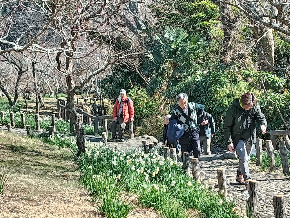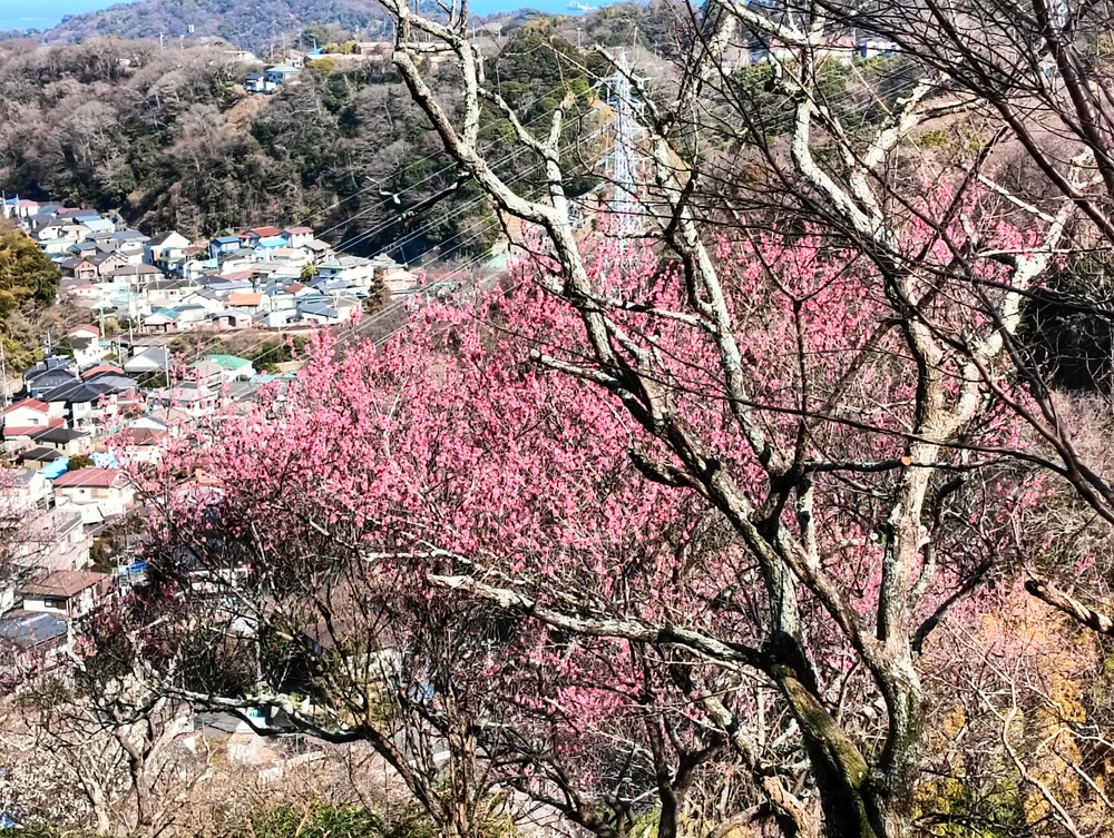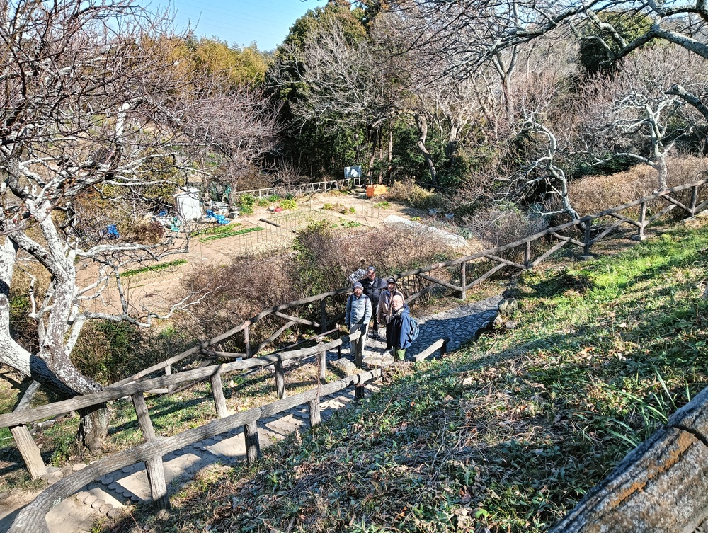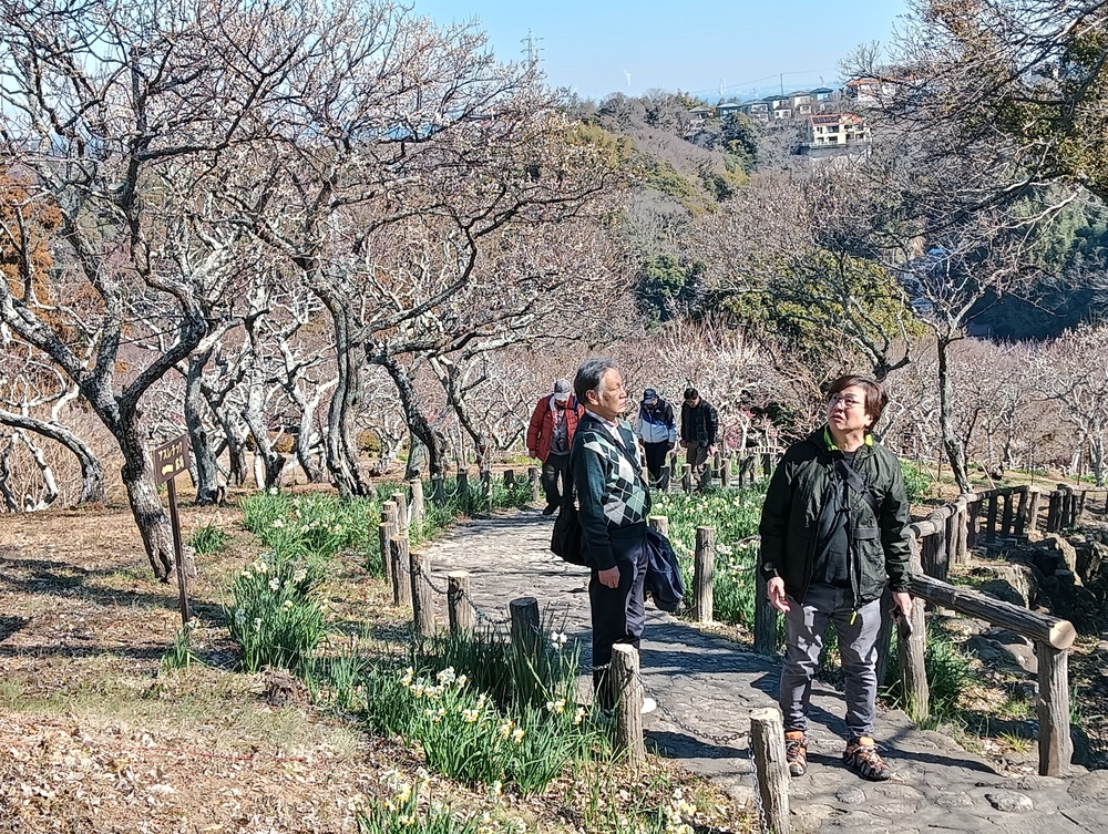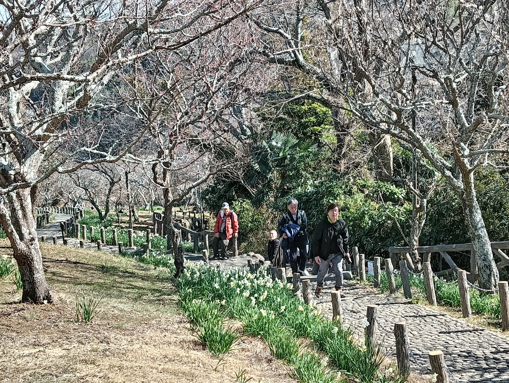 急峻な坂道を登りきると田浦梅の里、ここは1934年(昭和9年)に上皇陛下のご生誕を記念して、地元の有志が700本のウメを植えたのが始まりで、現在は約2,000本以上のウメが咲きほこる名所となっていて、満開には早いが甘い香りに包まれての散策をしました。