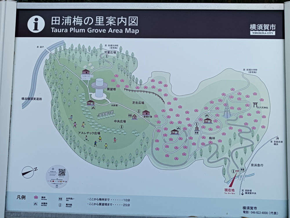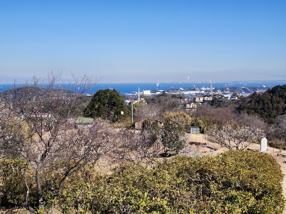 梅の里内にある展望台周囲は広々とした芝生で、眺望も素晴らしく、正面には東京湾が広がり行き交う船舶を間近に望む絶景、横浜ランドマークタワーや東京湾アクアライン、房総半島なども見渡せました。高速道路からも見える大看板の前で記念写真をパチリ