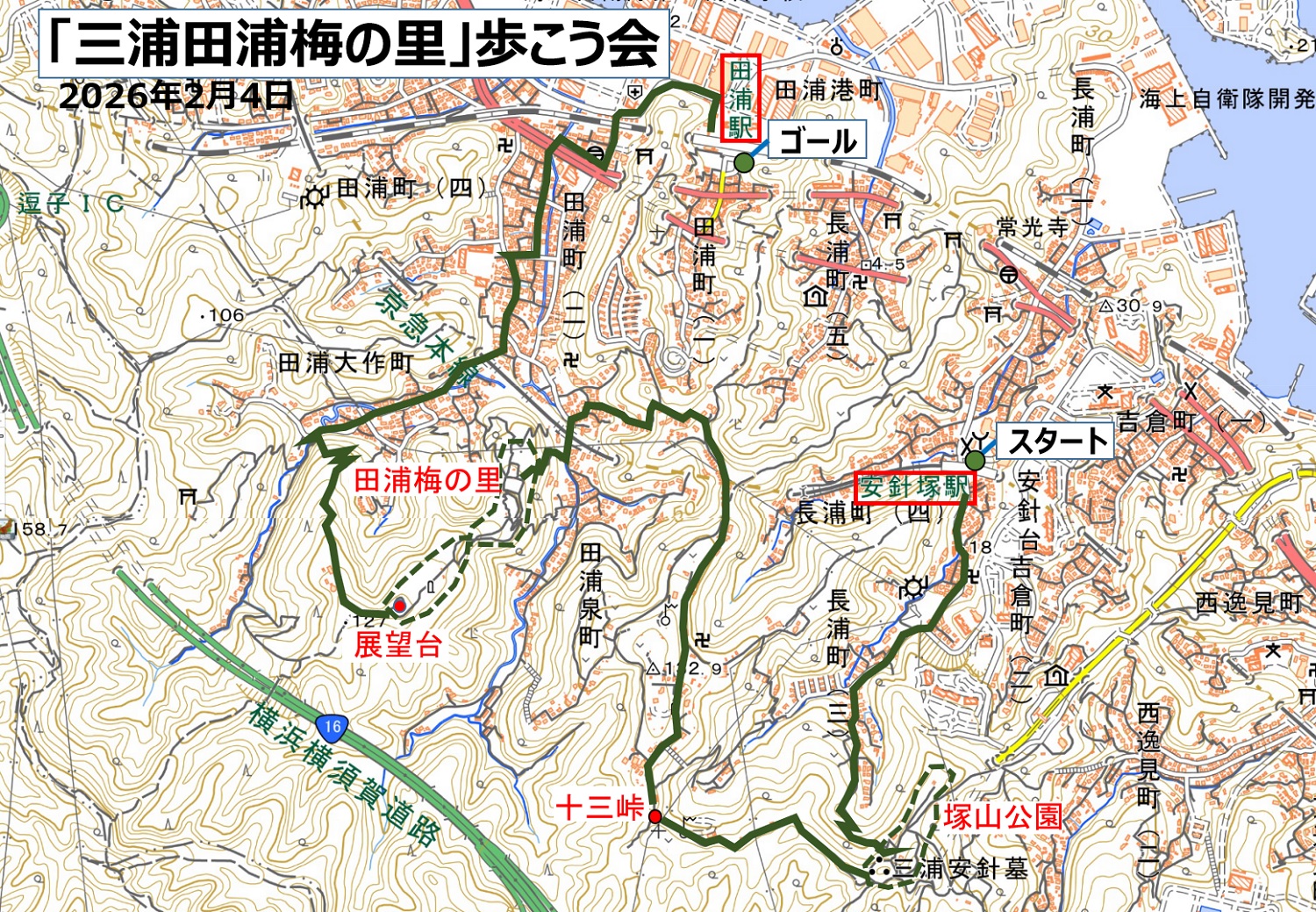 2026年2月4日(水)梅の香かおる三浦半島の京浜急行安針塚駅改札口前に元気な13名の参加者が集合。今回のコースは安針塚駅から田浦の丘陵地帯を三浦半島らしい起伏のあるややきつめの上り下り(高低差約120m)を歩き、歴史と自然、眺望を楽しみながらJR田浦駅まで歩きました。特に田浦梅の里は、約2,000本以上の梅が咲きほこる梅の名所とあって素晴らしかったです。