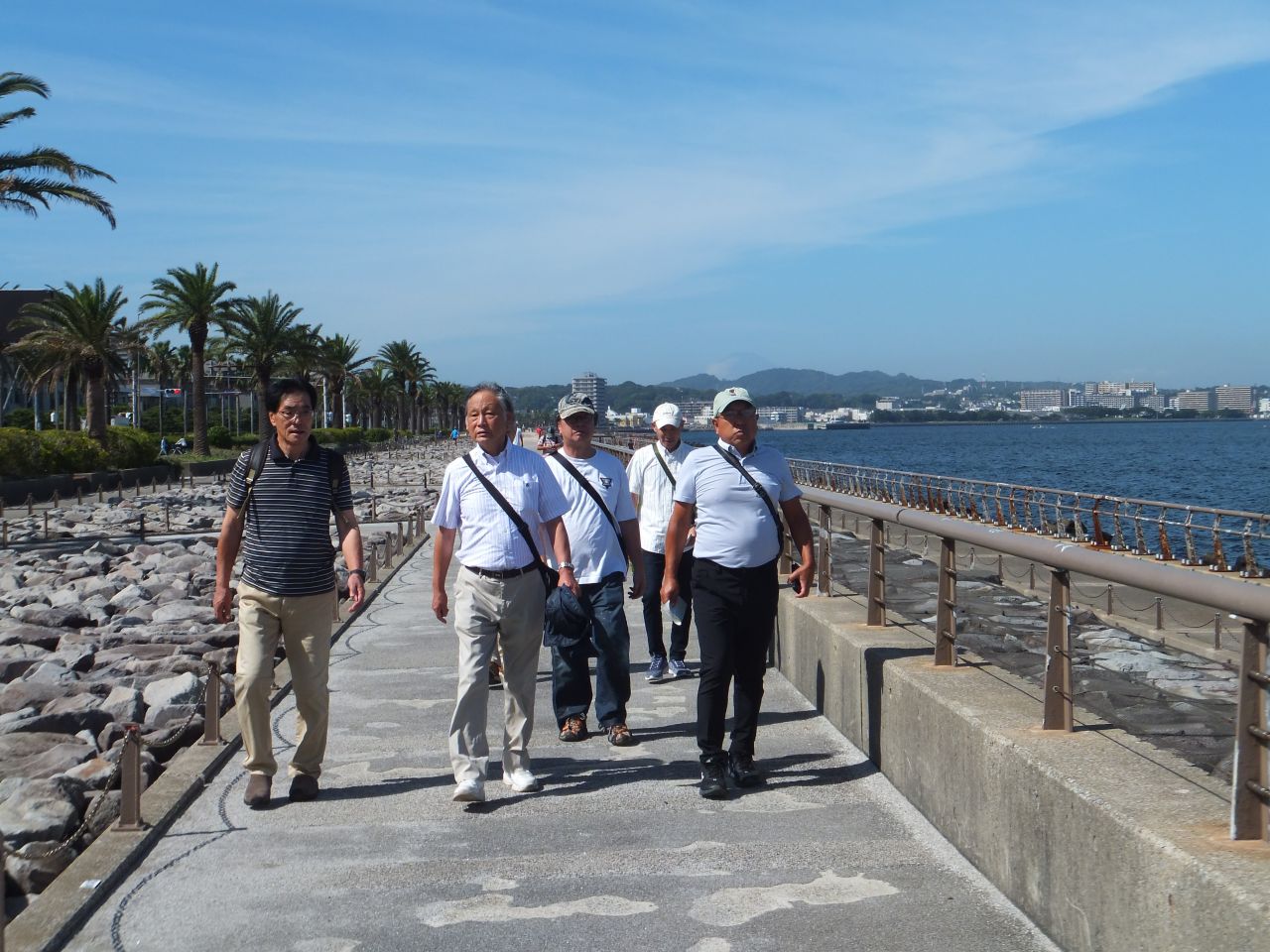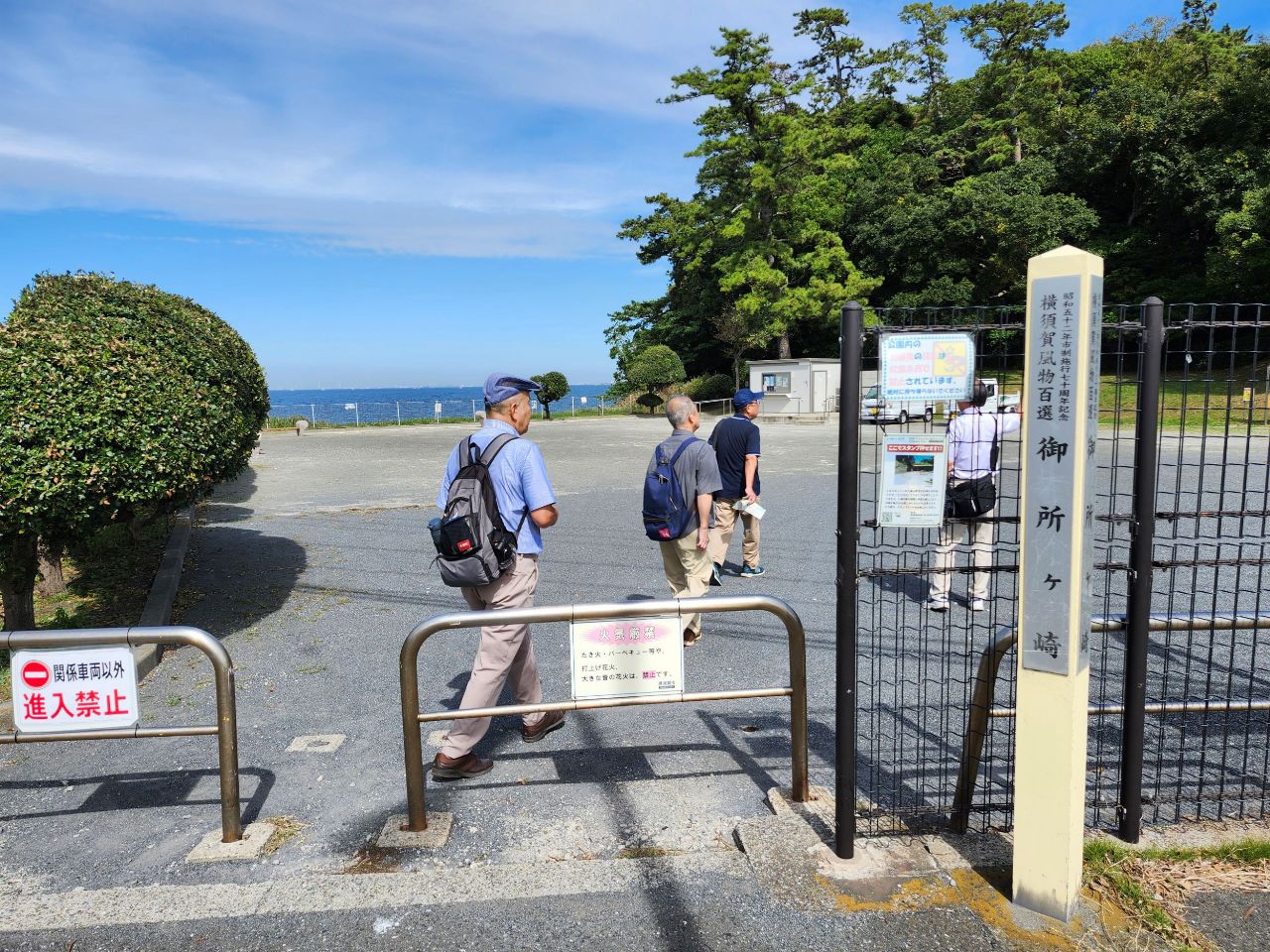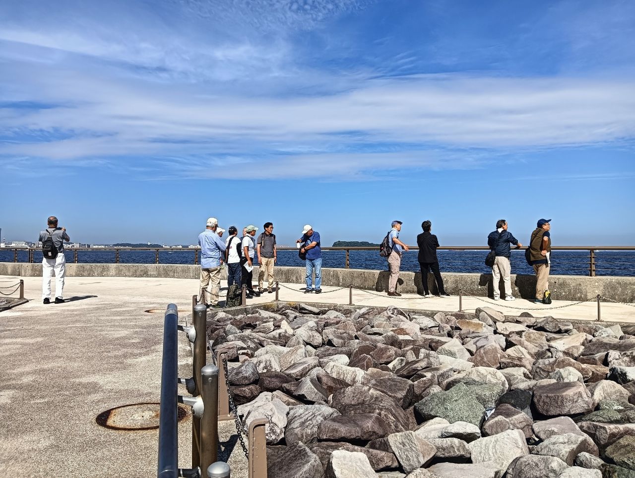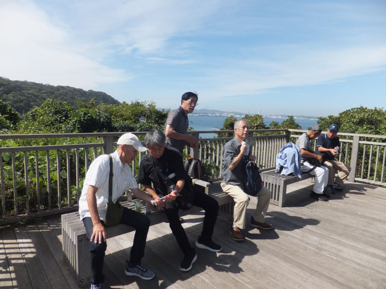 近くに猿島の見える海岸で、集合写真を撮影。前日の天気予報では曇りでしたが、当日は秋晴れとなり東京湾越しに房総半島がくっきりと見え、左手と多くには富士山も望め絶好の眺望でした。各自スマホ片手に暫し思い思いに写真撮影タイムとなりました。