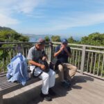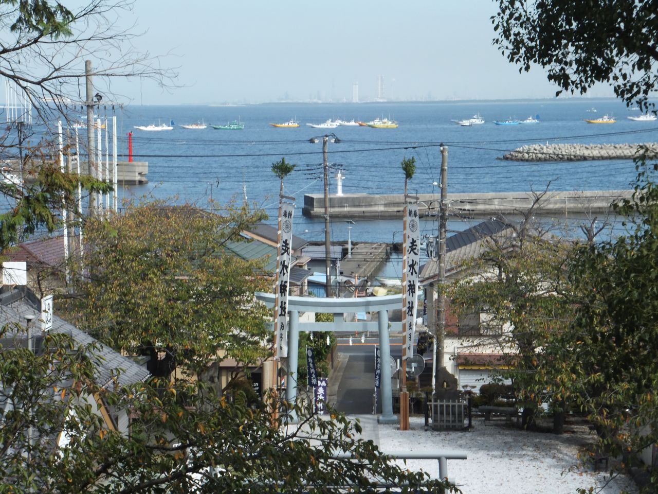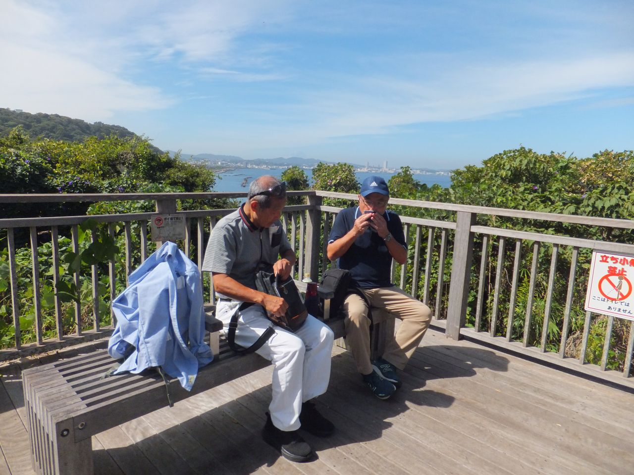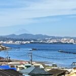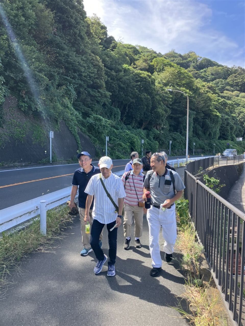 国の有形文化財に指定されています。引き続き海沿いの長い坂を上りながら振り返ると遠くに富士山が望めました。上空に鳴きながら舞うトンビもいます。 休憩所で給水小休止。