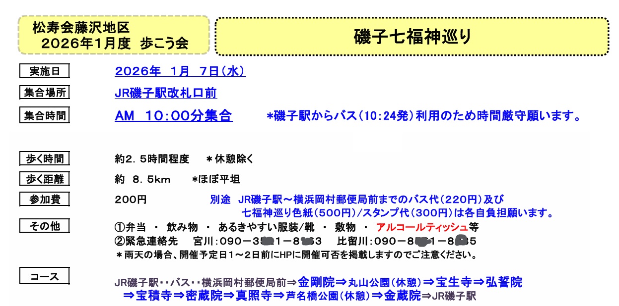 2026年 年明け1月度の歩こう会は、横浜市の”磯子七福神巡り”を企画しました。横浜市の磯子区と南区にある、7箇所すべてが高野山真言宗の寺院で構成されています。コースは約8.5kmとやや長めですが、ほぼ平坦のコースとなっています。1年の開運と健康保持を願い、多くの方のご参加をお待ちしております。参加ご希望の方は集合場所にお集まりください。