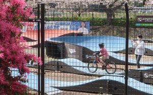 左から ・寒川中央公園のパンプトラックと桜 ・寒川中央公園の水辺の花模様 ・飛騨高山市内の中橋と桜 ・相鉄線緑園都市駅周辺の街路樹のハクウンボク