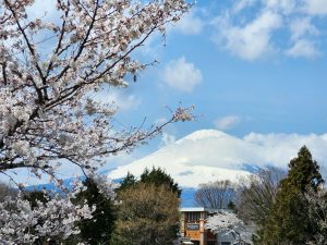左から ・御殿場の富士山と桜 ・岐阜県大垣城の石田光成と桜 ・熱海市のジャカランダ歩道 ・平塚駅前薔薇公園