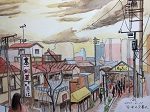 東京日暮里の谷中商店街の風景を描いた水彩画です。